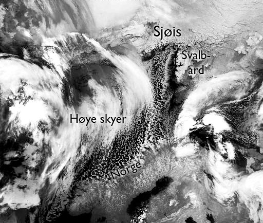 Den kalde luften strømmer rett nedover og svakt mot venstre på bildet, fra nordvest. De høye fjellene på nordvestkysten av Spitsbergen gjør at det dannes en stripe med turbulente skyer som strekker seg helt ned til kysten. Til venstre for denne ser vi en klassisk skytype i forbindelse med slike kaldluftsutbrudd. De kalles roll clouds og er av typen Stratocumulus.