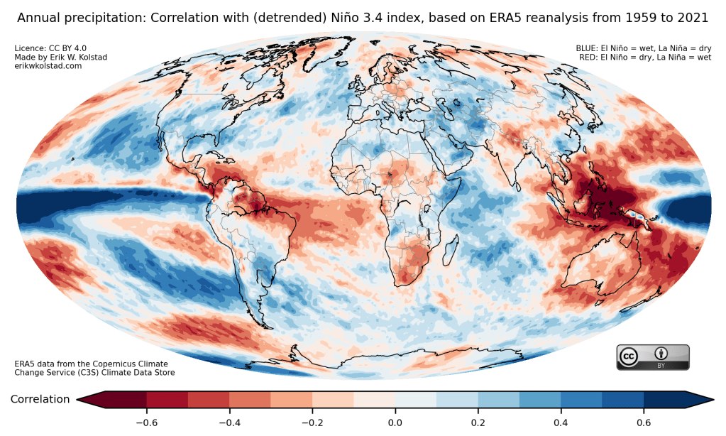 Both La Niña and El Niño influence weather more or less everywhere. The map below illustrates the linkage between precipitation (rain and snow) and El Niño/La Niña. The blue colours show areas that are usually wetter-than-normal during El Niño and drier-than-normal during La Niña. For instance, the current drought in East Africa, where the food security of millions is at risk, is linked to the ongoing La Niña. In the map, red colours indicate where El Niño episodes are dry and La Niña periods wet. Feel free to share and reuse.