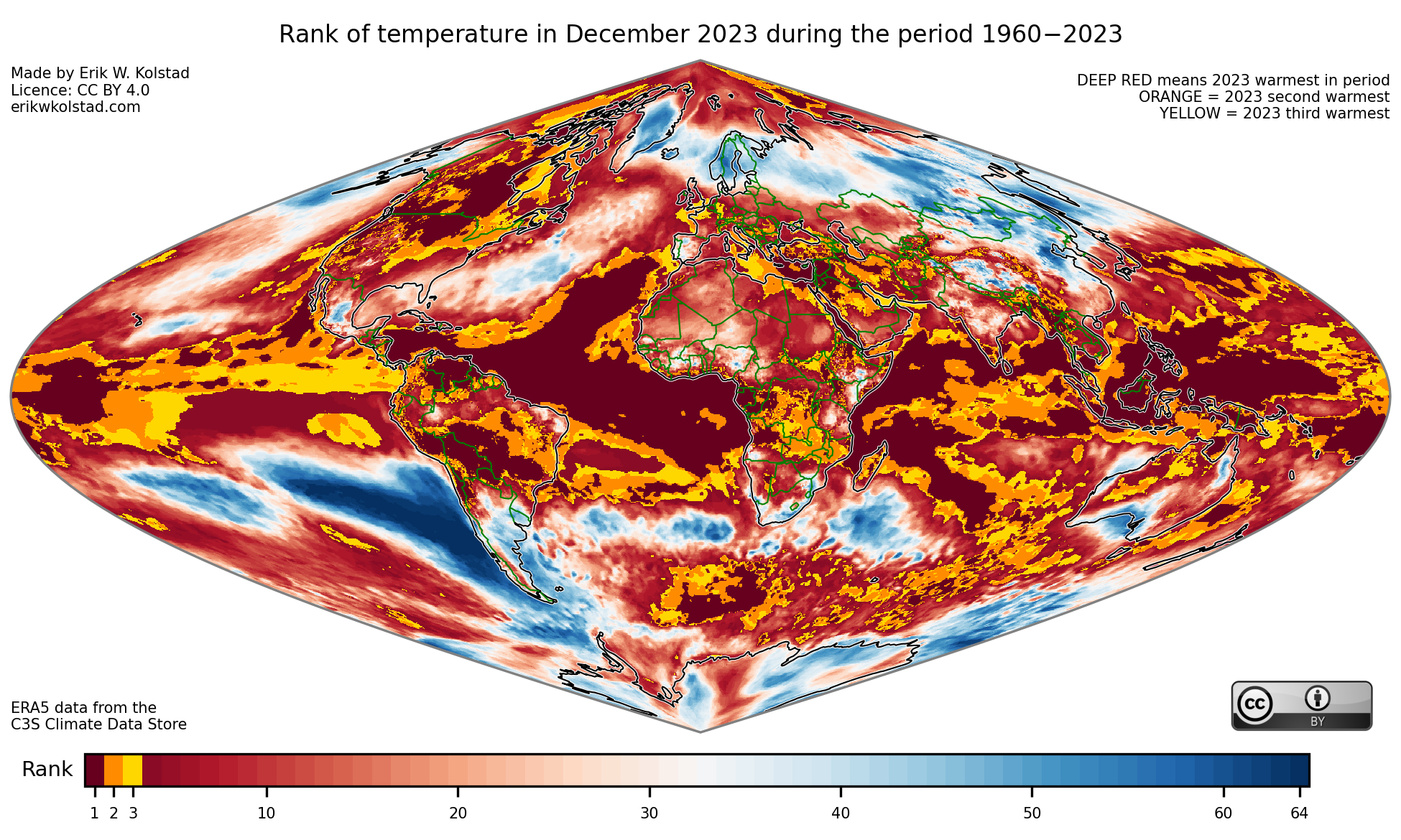 Deep red, orange and yellow colours indicate places where December 2023 was amongst the three warmest years, but note that the other red colours also indicate that December 2023 was high on the list.