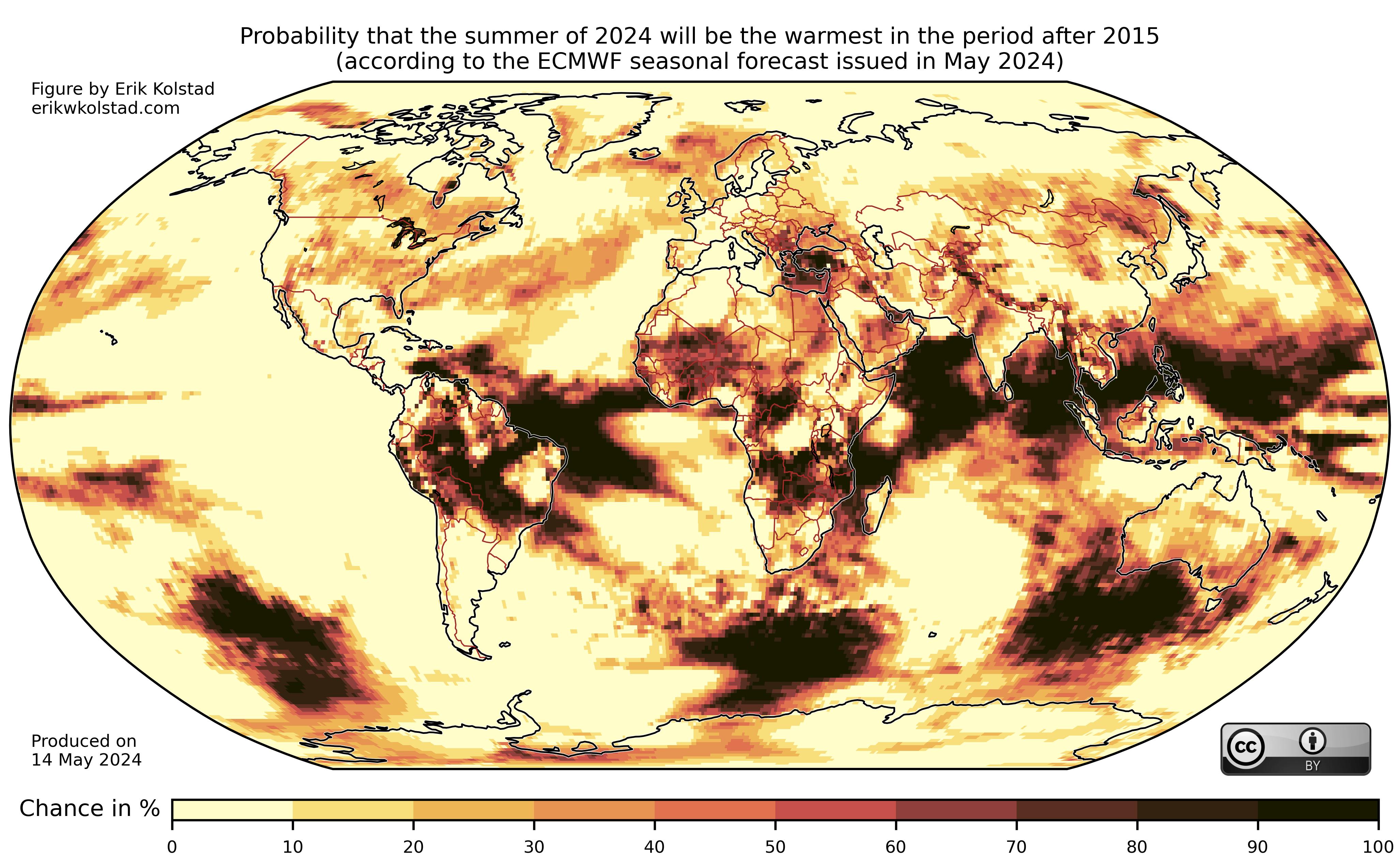 Comparing the likelihood of any event to just one previous observation is risky in the world of statistics. It is more robust to use a percentile as the reference. The figure below shows the estimated likelihood that June–August 2024 will be among the top three warmest boreal summers in the period starting with 2015.