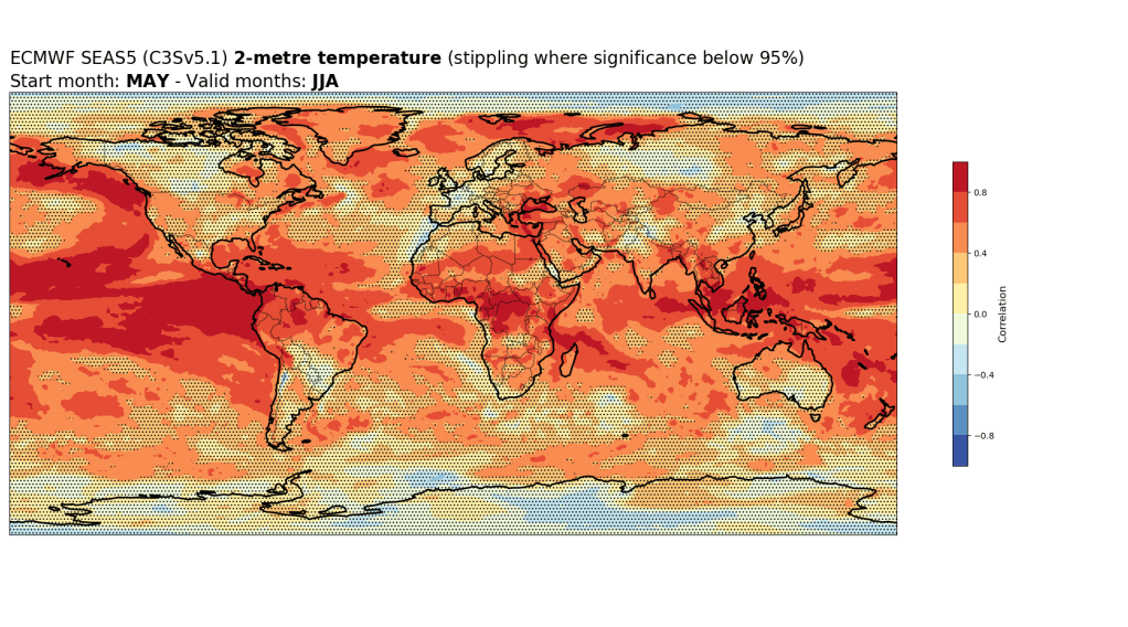 I conclude by reminding everybody that the uncertainty associated with June–August forecasts produced as early as May is high. Here’s a validation figure for the ECMWF model: