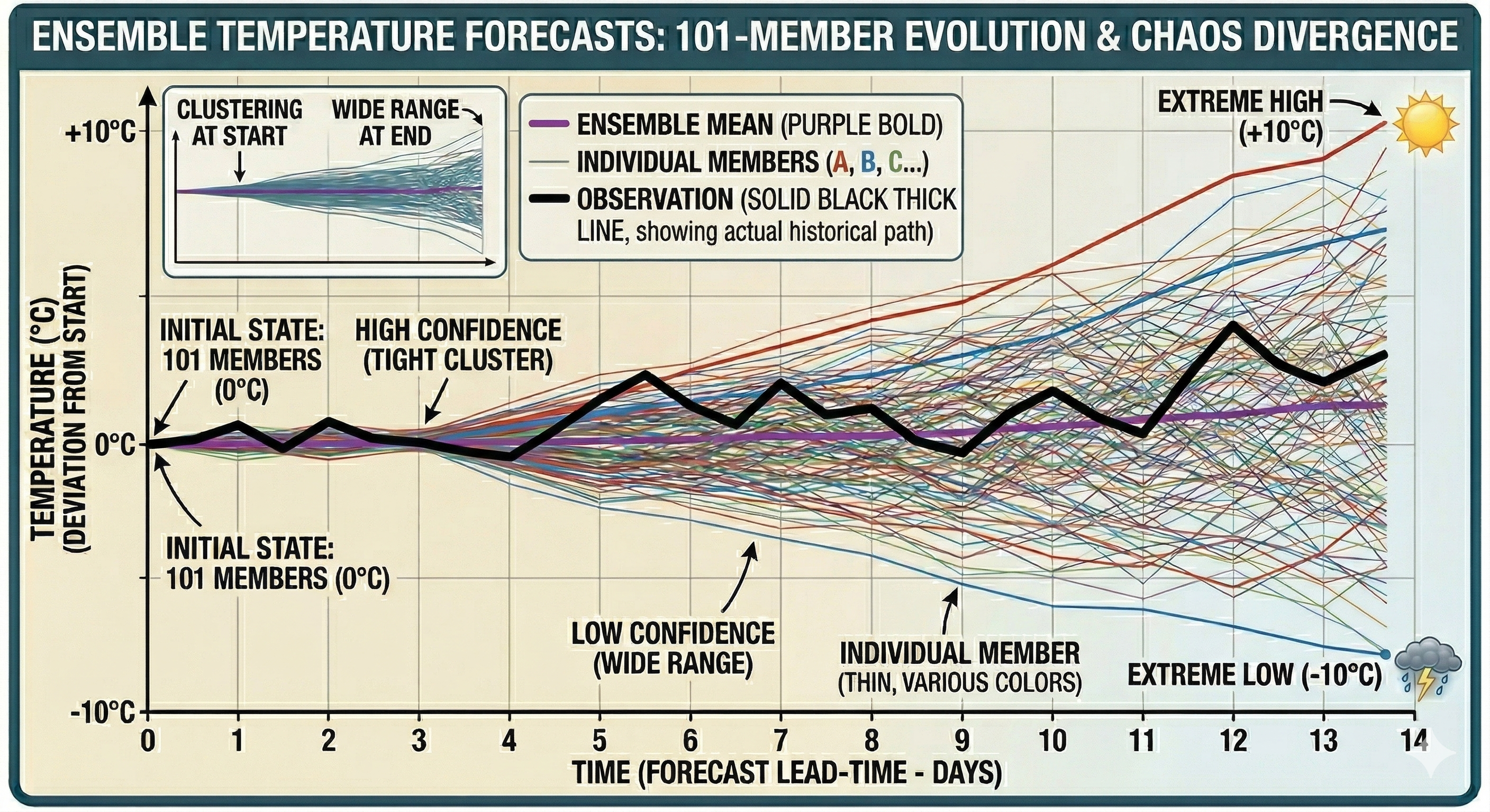 Pretty awesome if you ask me. The next step was to illustrate how this could look for an ensemble of temperature forecasts for a given location. I asked Gemini to emphasize how the individual ensemble members gradually diverge. Here’s the result (after some back and forth):