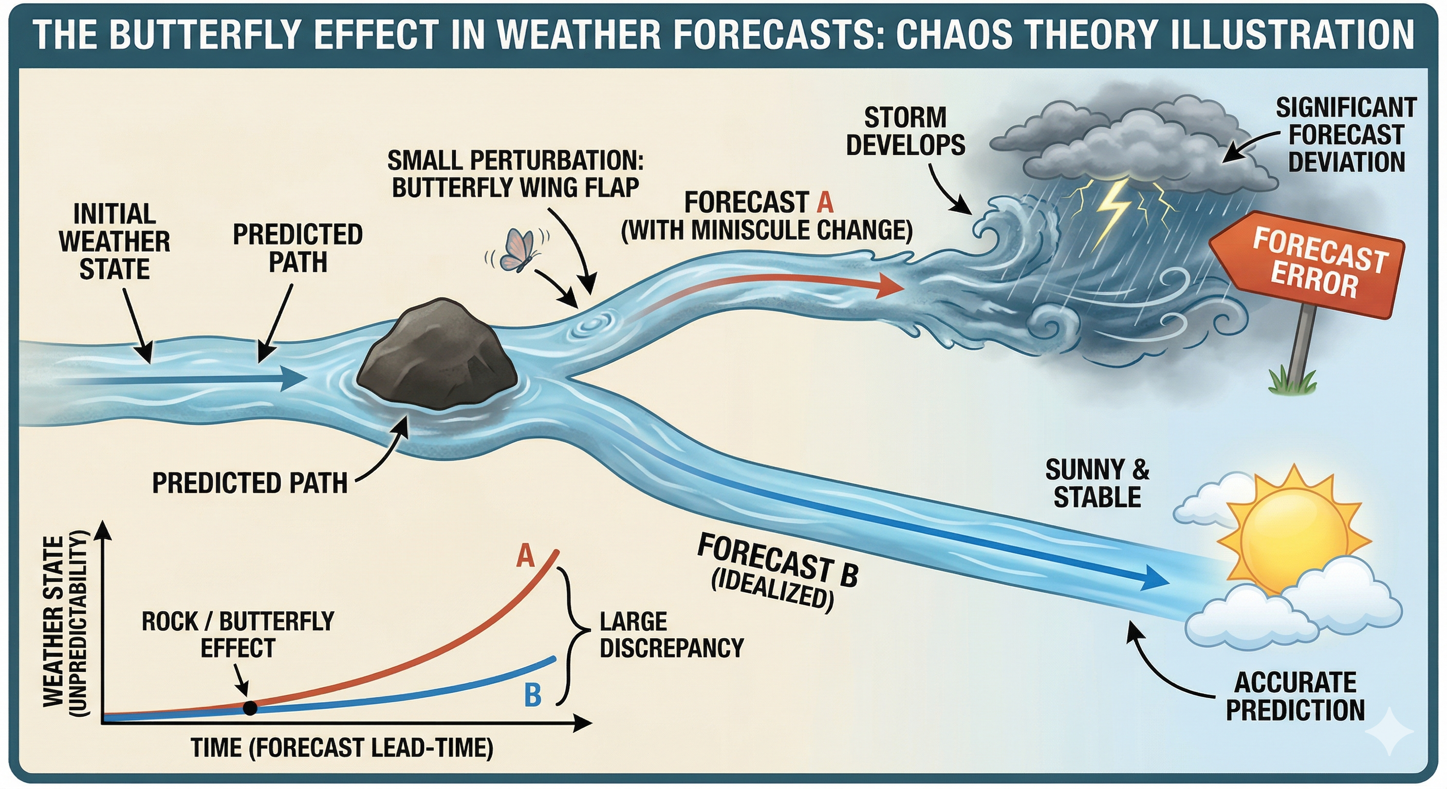 I wanted to illustrate this with an analogy. It is impossible to accurately predict how water will flow down a stream because there are multiple obstacles along the way. For instance, if there is a rock somewhere, we can’t know if the water will flow to the left or right of the obstacle. I instructed Gemini to illustrate this, and here’s what it came up with: